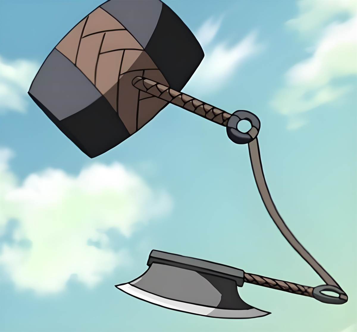 這把武器造型很奇特,繩子一端連著刀,另一端連著錘子,攻擊方式是先用刀砍,再用錘子砸在刀背上以追加力量,號稱可以擊潰一切防禦。這個設定不知道靠譜不,咱就說假如,讓柱間召喚個五重羅生門出來,不知道這錘子能不能破防呢?估計有些費勁。
