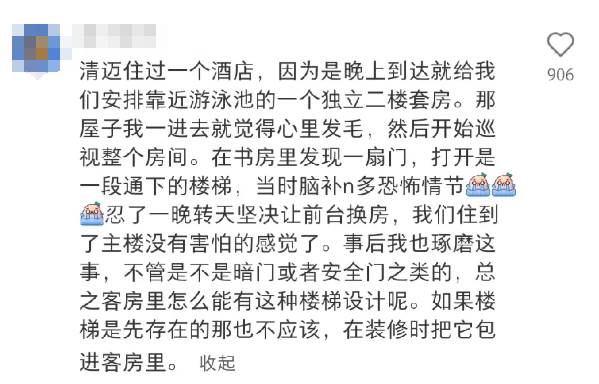 如果你在入住酒店后,突然發現房間內有隱蔽的樓梯或者通道,那一定要引起警惕。有游客分享過,自己在清邁的一家酒店住進了一個靠近游泳池的獨立二樓套房,房間里有一扇看似普通的門,推開后竟然通向一段隱秘的樓梯,令人毛骨悚然。雖然這些樓梯有可能是酒店設計的安全門或是緊急出口,但如果沒有明確的標識或安全提示,就很容易讓人產生不安的感覺。