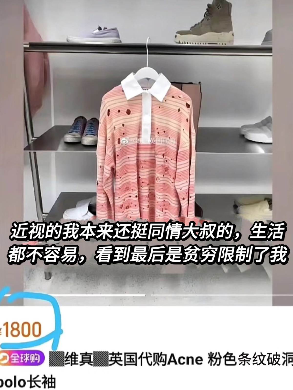 從淘寶一搜,可以發現這件衣服出自于歐美品牌Acne Studios,價格居然高達1800人民幣(約新台幣7970元),原以為大叔穿著破洞衣服,是因為窮困才捨不得換,但事實上是自己眼光太短淺,也讓原PO不禁自嘲:「貧窮限制了我.