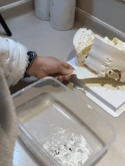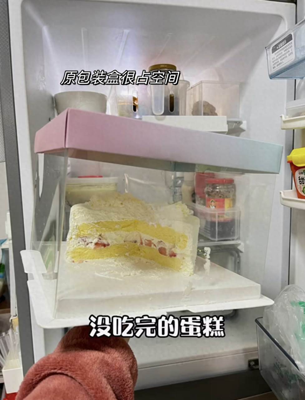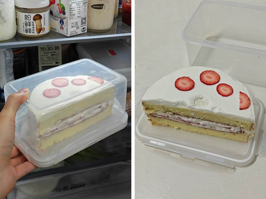吃不完的蛋糕如果帶包裝盒一起直接放進冰箱,不僅占空間,而且密封性不好,不保鮮又容易串味。單獨去買個收納盒,又沒必要,而且蛋糕裝進收納盒里,粘上奶油還很難洗。
