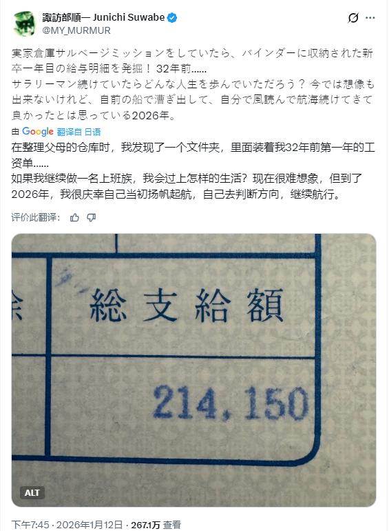 在貼文中,諏訪部順一曬出了自己剛踏入社會時的薪資數字。