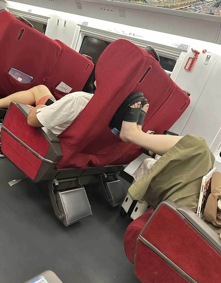 一名打扮時髦的女子一上車就脫掉高跟鞋,換上一次性拖鞋,隨即將雙腳高高抬起,鞋底直接抵住前座的椅背。前座的乘客頓時感覺椅背一陣陣被推擠,回頭只見那雙拖鞋底在眼前晃來晃去,還帶著灰塵。她客氣提醒:「是不是有人把家教落家了?」女子竟白眼一翻,無奈把腳放下!