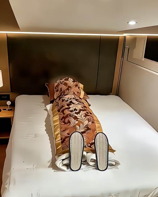 影片開頭就帶著戲謔的文字:「準備退房了,給客房阿姨留個驚喜」,但鏡頭一轉,床鋪的模樣卻讓人頭皮發麻 —— 被子被仔細疊成人體輪廓,枕頭擺出上半身的形狀,床尾還整整齊齊擺著一雙拖鞋,從門口遠遠望去,活像一個人平躺在床上,連被子的褶皺都刻意模仿人體曲線,乍一看根本分不清真假。