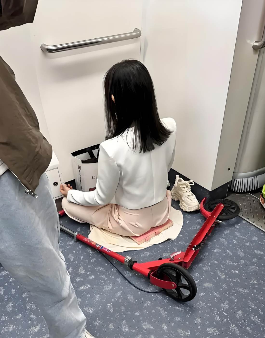 「這是在干嘛?」「行為藝術嗎?」「也太怪了吧……」車廂里響起了竊竊私語。有人覺得好笑,有人覺得不雅,更多的人是和我一樣,充滿了好奇。我偷偷拿出手機,拍下了這「奇觀」,隨即分享到一個常逛的本地論壇上,配文調侃道:「求助!現在捷運的座位已經緊張到需要自己‘開辟’地板位了嗎?這位小姐姐是什麼操作?」