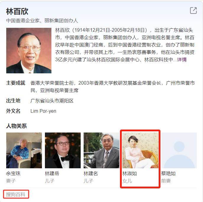網上關于林淑如的身世很撲朔迷離,曾有報道稱:她是香港百億富豪林百欣的女兒,其胞弟是寰亞總裁林建嶽。