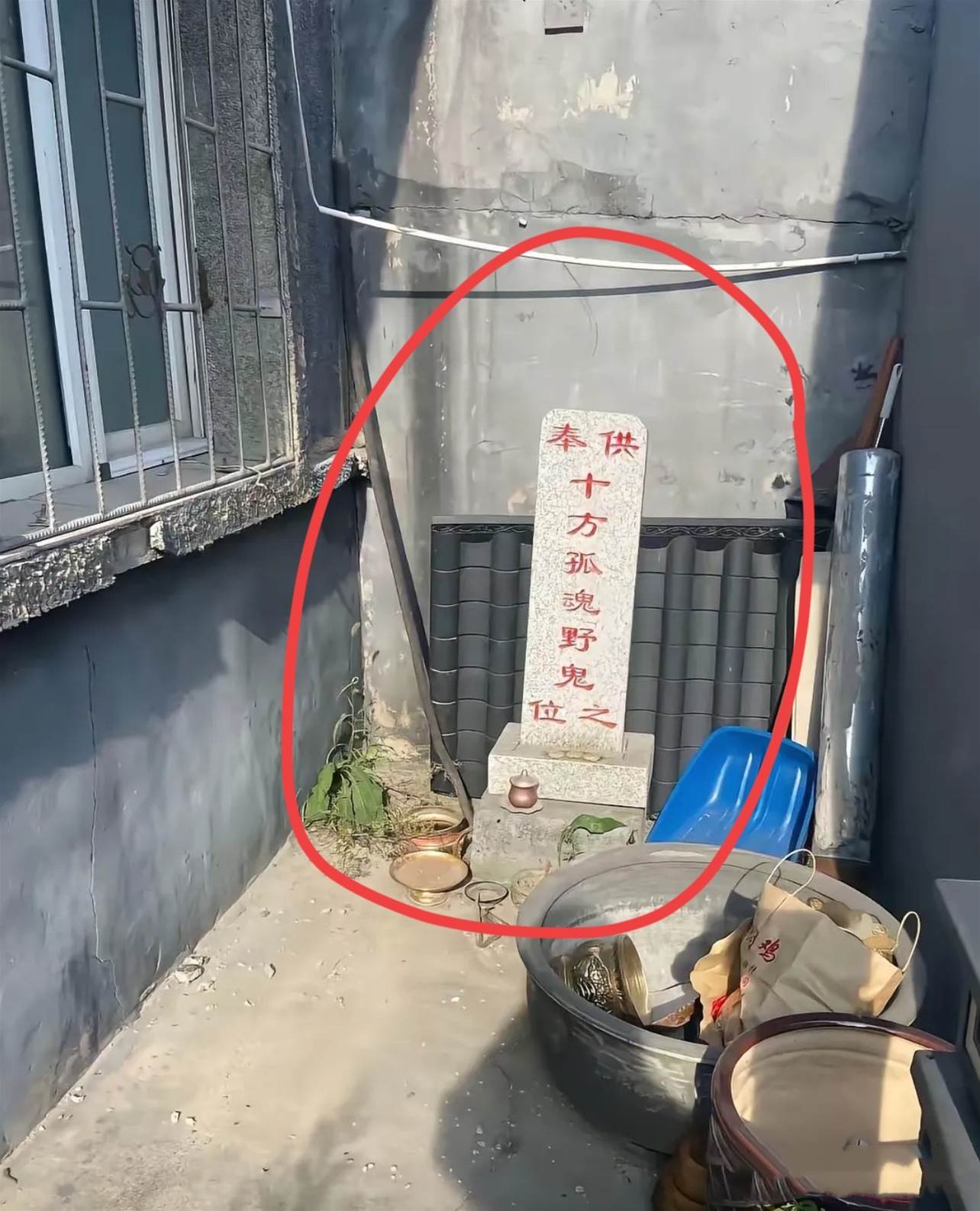 推文網友上傳了一張陽台照片:水泥砌成的簡易台面上立著石碑牌位,赫然刻著「供奉十方孤魂野鬼之位」字樣。推文人直言「看起來挺瘆人」,卻意外引發網友兩極解讀: