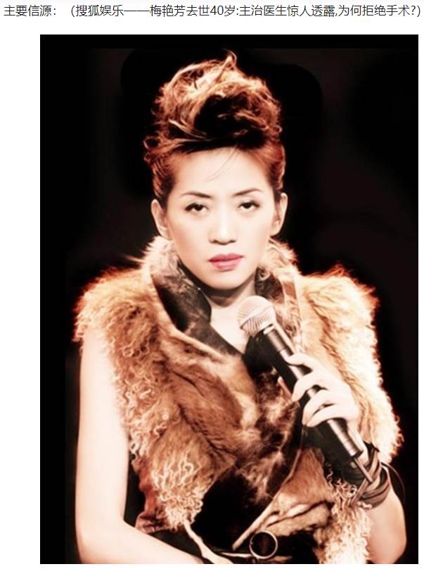 2003年,梅豔芳去世不久後,他的主治醫生在一次採訪中透露:「其實梅豔芳的病完全是有可能治好的,但就因為一件事,她主動放棄了治療!」