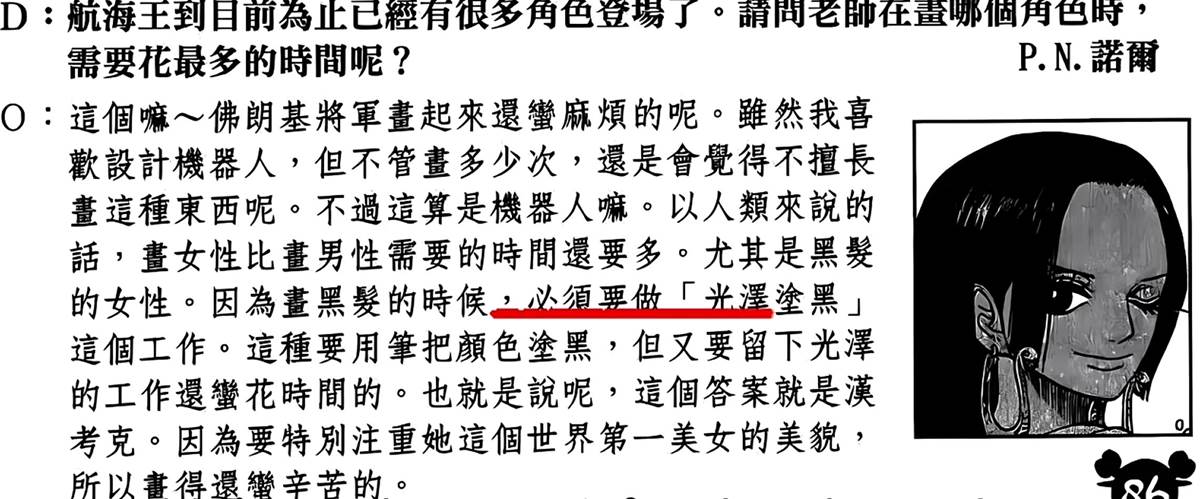 尾田認為烏黑靚麗的頭髮都是女孩子才有的,所以海賊王裡的男性角色,頭髮普遍都沒有光澤。