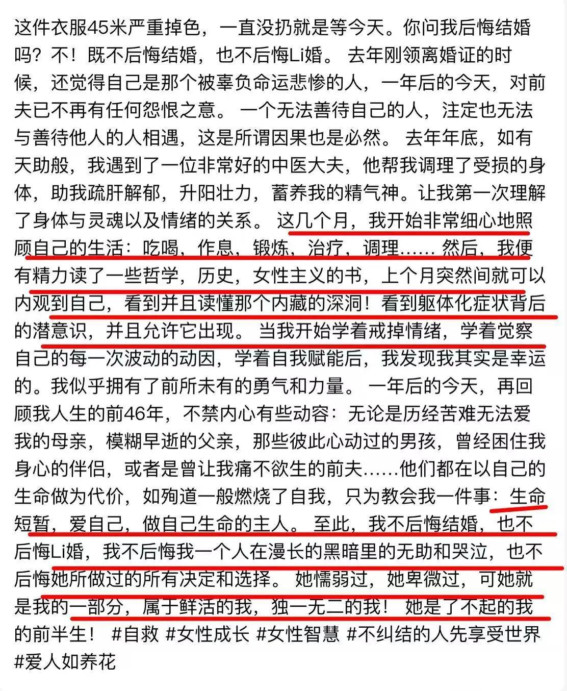 近日,刷到北京一女子發視訊分享自己離婚一年后的照片引起熱議,網友表示:可以看出穿著同一件衣服的她一年后變得溫柔知性眼里有光了。她表示這件45米的衣服,一直沒有扔就是在等現在這一刻。可以看出女子通過自己的努力,自己把自己救活了。