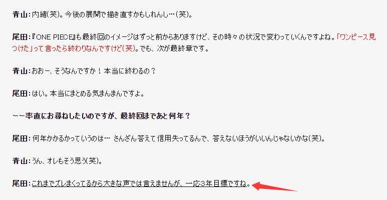 當時兩個長篇王者討論什麼什麼完結,最後尾田說《海賊王》目標在3年時間進入最終回。