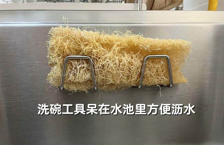 大家記住,百潔布、絲瓜絡這種清洗用具,最好是掛在水池的內壁,用完后瀝干水分時,不會弄得台面上到處都是,取用時也很方便,千萬別收納在台面上,又亂又會二次污染。