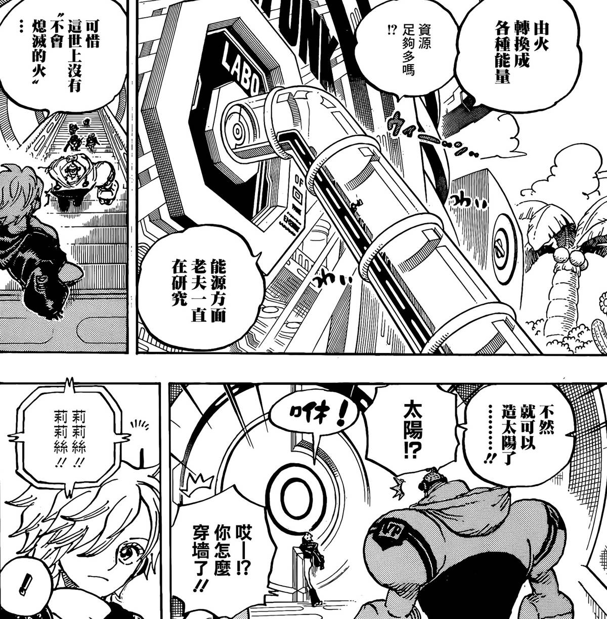 草帽一夥剛到蛋頭島時,莉莉絲就說過,如果有永不熄滅的火焰,就能造出太陽;老貝在直播裡提到聖母火焰,也說自己離太陽太近了,這些地方都是伏筆,暗示了「太陽」是能源。老貝認為自己的研究是禁忌,神典裡也說人類觸碰了「禁忌的太陽」,那麼這兩個東西大機率是一回事。