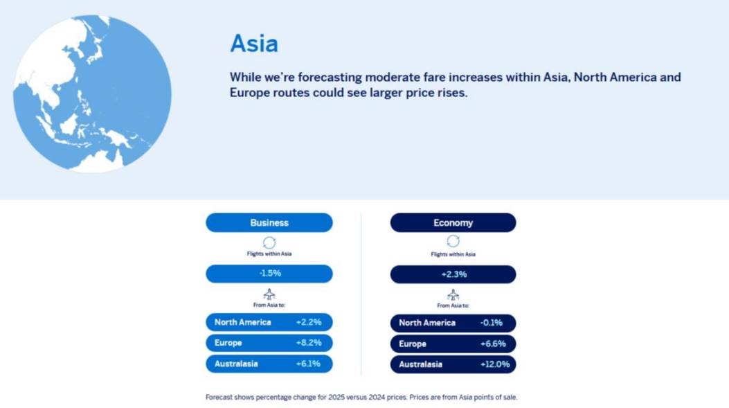 從不同地區來看,2025年機票價格上漲幅度的不均衡性也引發了旅客的關注。尤其是澳洲,預計將出現最大幅度的票價上漲。