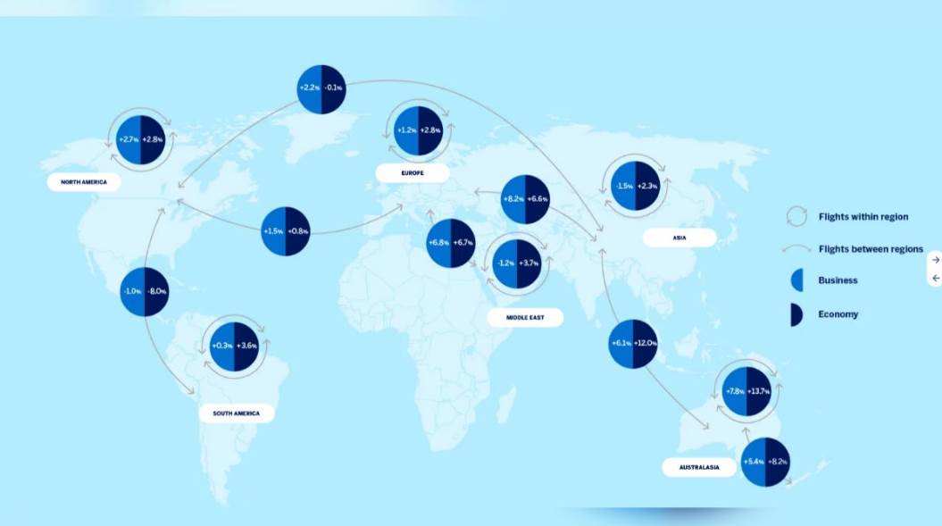 亞洲的情況則略有不同,亞洲內飛的經濟艙票價預計將上漲約2.3%。但如果從亞洲飛往歐洲的航班來看,票價的上漲幅度則會更為明顯。由于避開俄羅斯領空的航程更長,航空公司不得不在航線調整上投入更多成本,加上部分歐洲航空公司已退出中國市場,預計亞洲飛歐洲的經濟艙票價將上漲約6.6%,而商務艙票價則可能上漲8.2%。