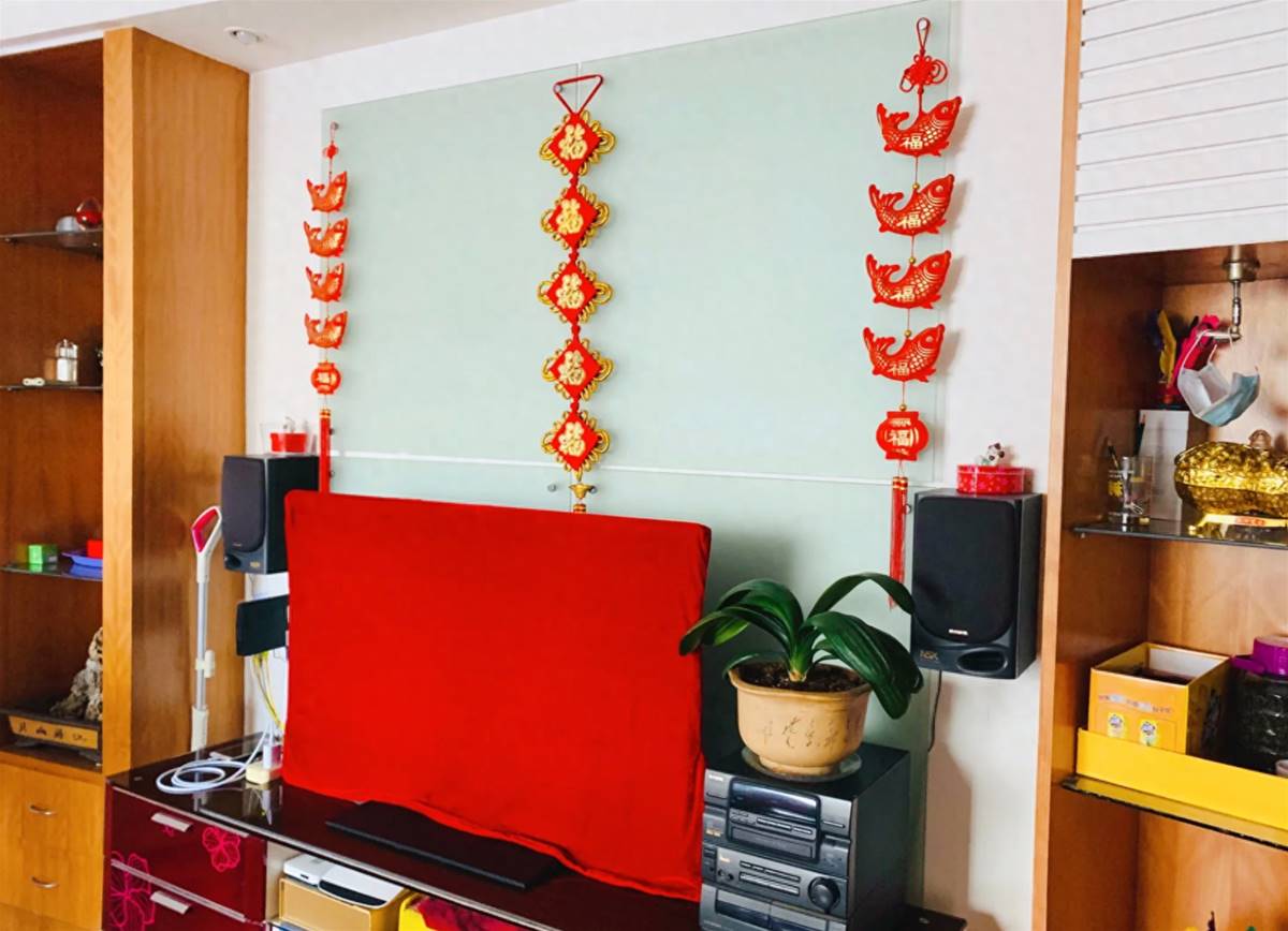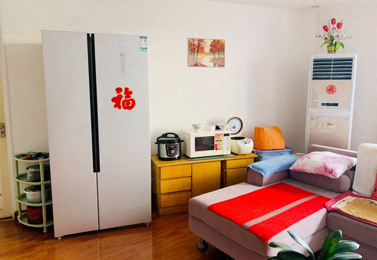 沙發一側依次擺放了冰箱、餐邊柜、空調,雖說動線上不太合理,但對于兩位老人來說,卻與他們的生活習慣做到了貼合。