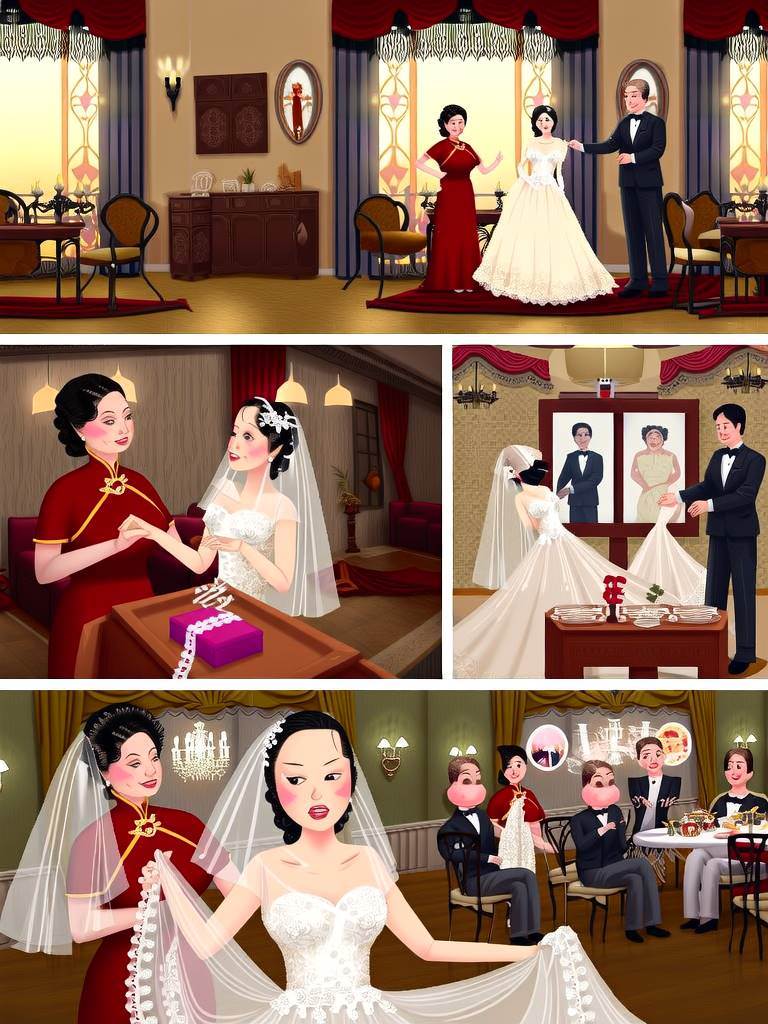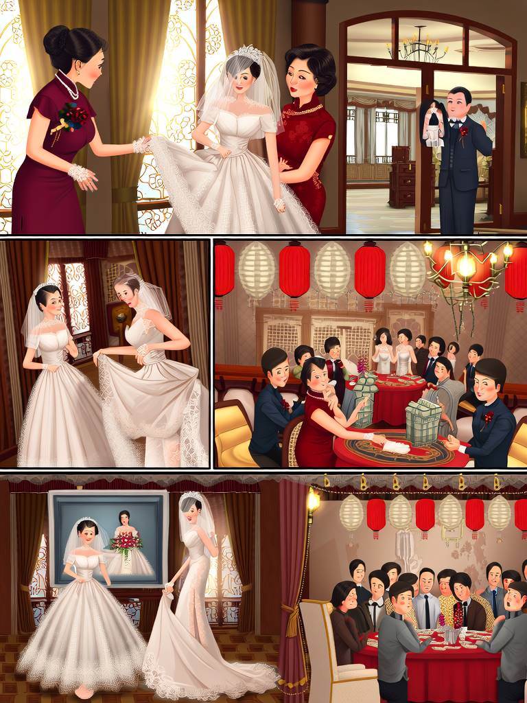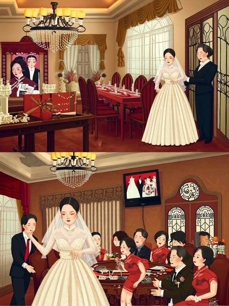 正當司儀尷尬地圓場時,林曉突然掀開頭紗,露出精心打造的妝容。她落落大方地拿起話筒:「感謝婆婆讓我穿上承載家族記憶的婚紗,雖然它和我的審美相差20年。」全場響起善意的笑聲,新人父母席上的王阿姨臉色發青。