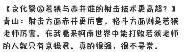 並且,作者青山剛昌曾經說過整部作品裡只有京極真能打倒若狹留美,這說明若狹留美就是作品的戰力第二人,所以她的格鬥能力肯定也在赤井秀一之上。