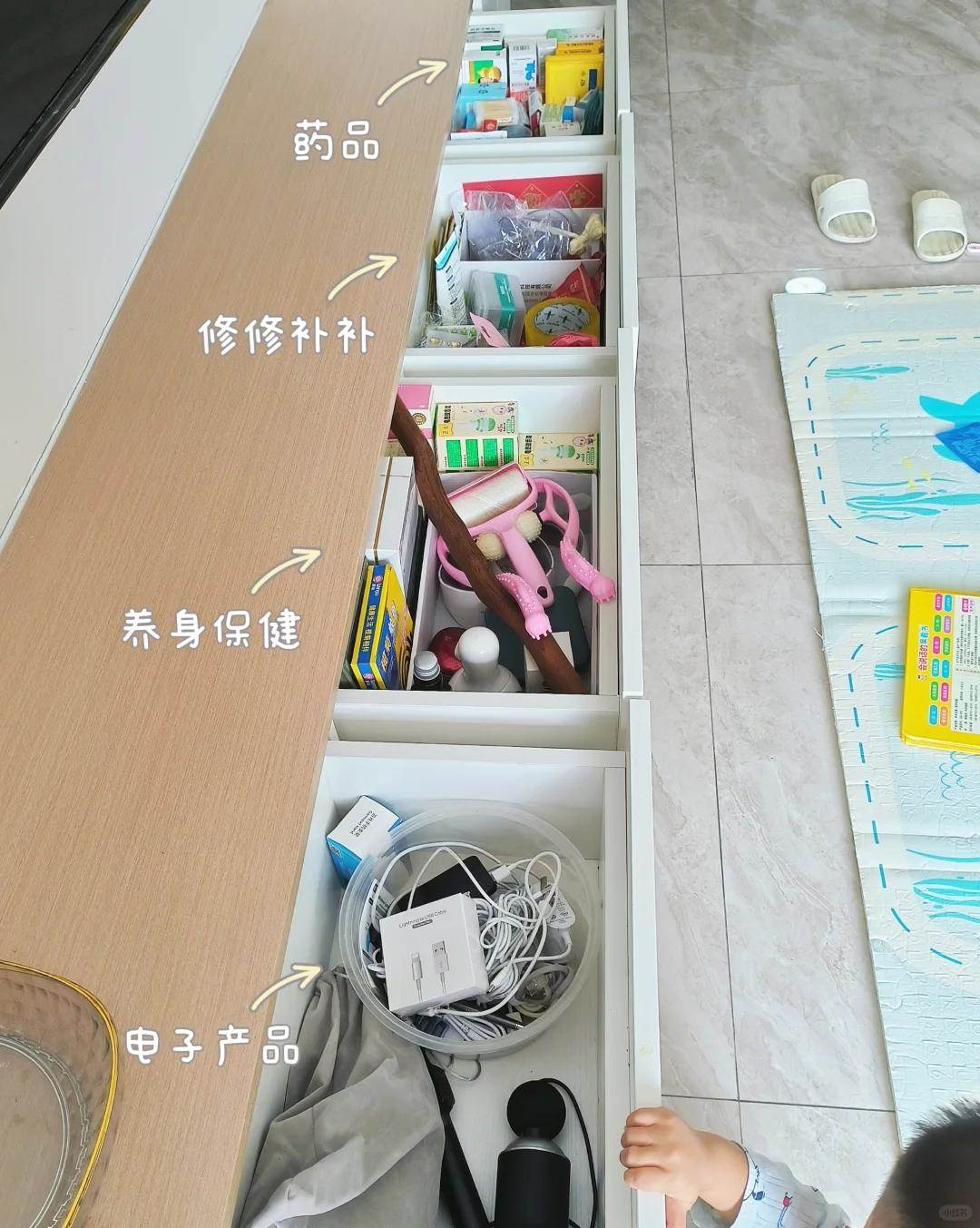 04.抽屜里已經用不上的雜物說明書卡片、壞掉的遙控器、已經很久不用的電源線插排,沒有用的鑰匙,過期的藥品保健品。