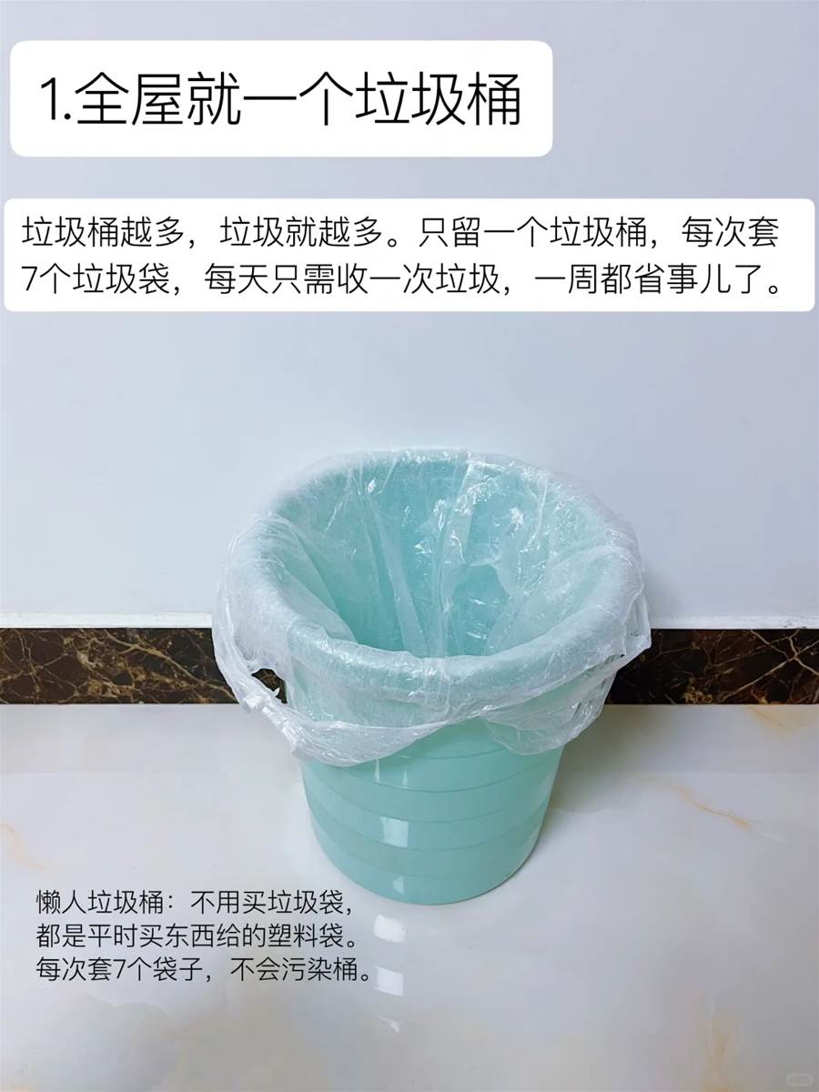 之前我犯了個錯:每個房間都放垃圾桶,臥室、客廳、廚房各一個,結果每天都要挨個倒,漏套一次袋還會臟桶。現在只在客廳放一個大垃圾桶,一次性套 7 層垃圾袋 —— 倒垃圾時拎走最外層,里面的自動頂上,一周倒一次就行!更省事兒的是,我用的都是快遞拆下來的塑料袋,不用專門買垃圾袋,一年下來還省了幾十塊,再也不用囤 「垃圾袋」 這種小東西了。