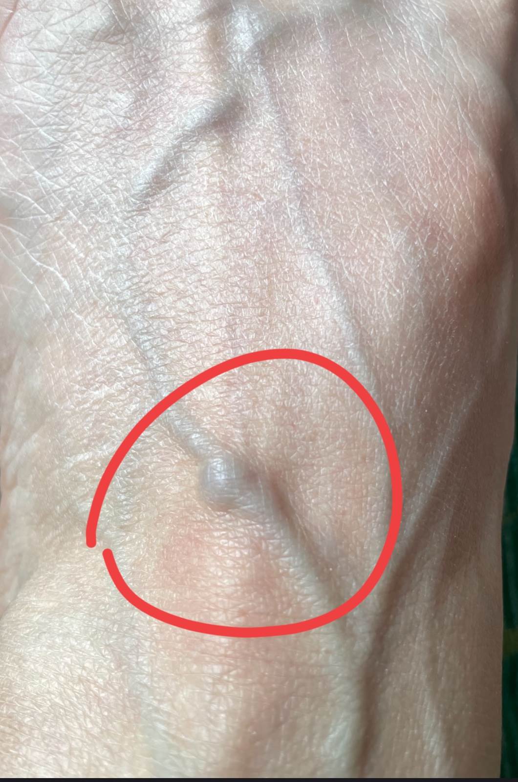 從特寫照片可見,這個膚色略淺的柔軟疙瘩明顯突起于皮膚表面,正好位于一條清晰可見的藍色靜脈之上。當事人描述:「以前沒注意,昨天洗完腳一看腳面,突然起了一個疙瘩,比其他血管粗很多,看著很嚇人。」