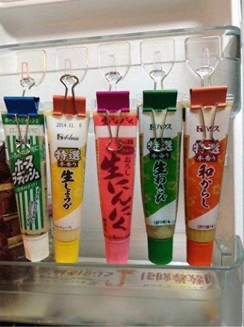 膏狀物品擺在桌面容易臟,堆在一起又很亂。用幾毛錢的夾子夾起來,掛在方便取用的位置,也可以掛在冰箱。