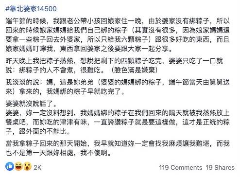 有位人妻在臉書「靠北婆家」發文,表示某次端午節時,自己和老公帶著小孩回到了娘家住一晚,在離開之前,媽媽想起她的婆婆沒有包粽子,于是就拿了6顆讓她帶回去分享給親家。後來隔了幾天,她把冰箱裡剩下的粽子拿出來蒸熱,結果婆婆只吃了一口,就滿臉嫌棄地說「綁粽子的人不會煮,很難吃」,似乎拐著彎想給她難堪。不過她也不傻,當下只是淡淡開口對婆婆說,「媽,這是妳弟弟拿來的(也就是婆婆的媽媽綁的粽子),我媽綁的早就吃完了」讓對方當場說不出話來。