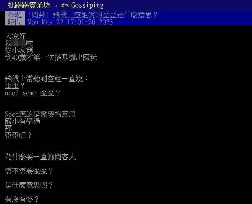 一位鄉民在PTT八卦版發問:「飛機上空姐說的歪歪是什麼意思?」原PO表示自幼家貧,直到40歲才第一次搭飛機出國玩,然而他在機上聽到空姐一直說「歪歪?need some歪歪?」