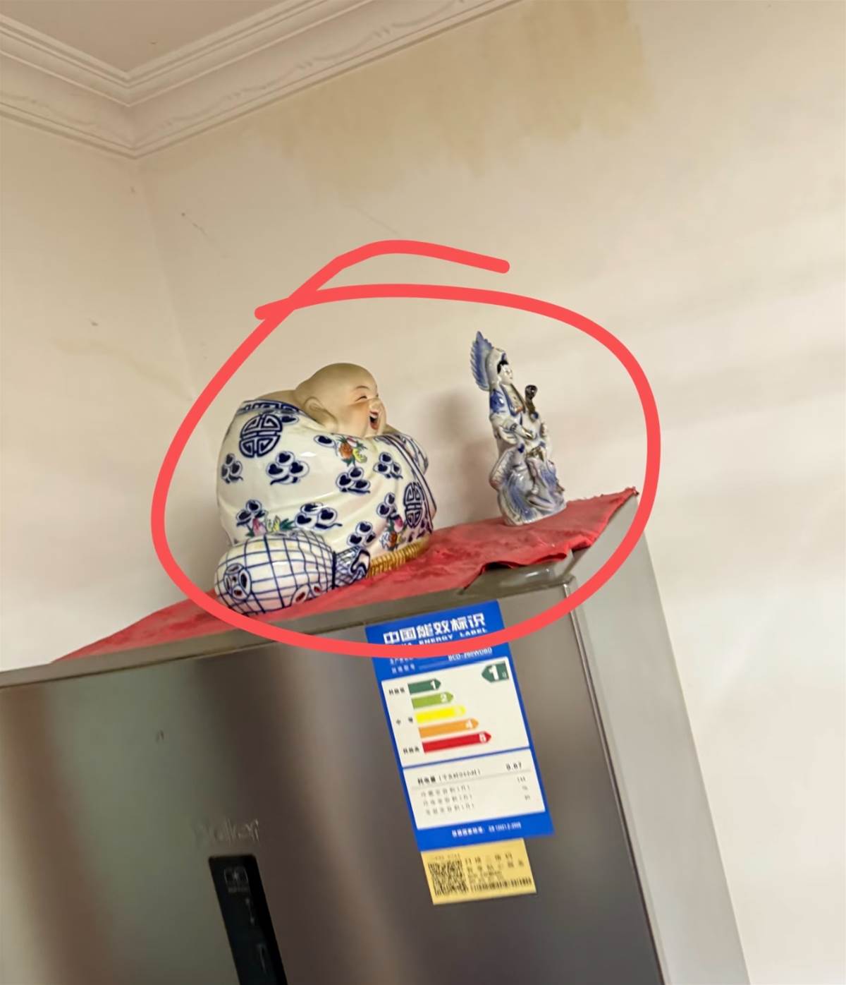驗房那天,房東推開出租屋的門,一切似乎都還整潔。但當他走到廚房,目光落在冰箱頂端時,不由得停下了腳步——兩尊藍白相間的佛像雕塑,正靜靜立在鋪開的紅布上。