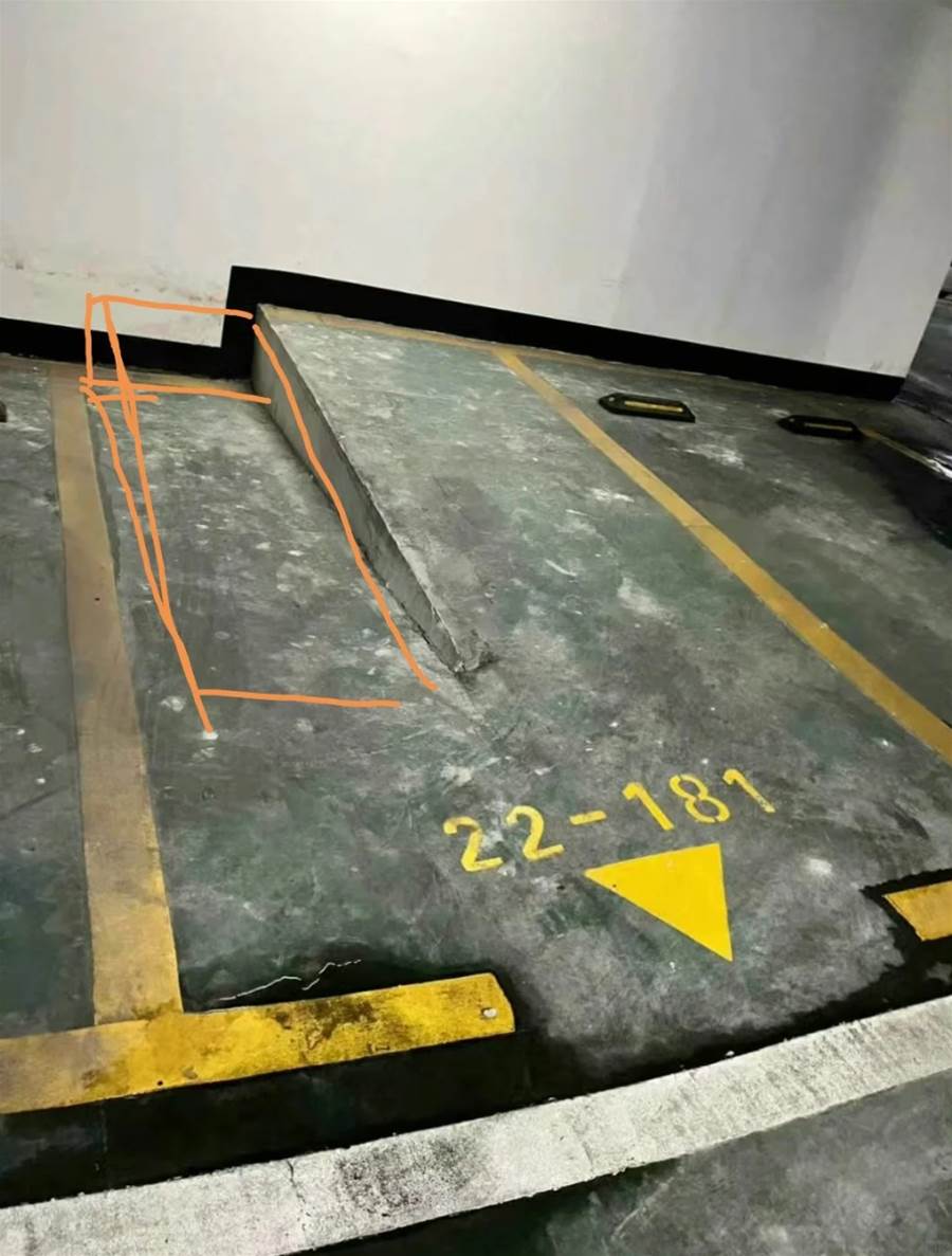 那是一個靠牆的角落車位,地面上用鮮黃色標線清楚劃出停車范圍,但就在車位左側,一道明顯的高低落差橫亙其中,像個小小的斷層。從照片中可以看到,這個落差大約有十公分高,邊緣還有些微破損,看起來確實會造成停車困擾。