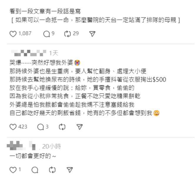 也有網友想起自己也重病的外婆,「哭爆⋯⋯突然好想我外婆!那時候外婆也是生重病,要人幫忙翻身、處理大小便;那時候去幫她換尿布的時候,她的手擅抖著從衣服掏出500,放在我手心裡緩慢的說:『給妳,買零食,偷偷的』。因為我從小就非常挑食,正餐不吃只愛吃糖果餅乾,外婆總是怕我餓、都會偷偷趁我媽不注意時塞錢給我,自己都吃好幾天的剩飯省錢。她有的不多,但都會想到我」。
