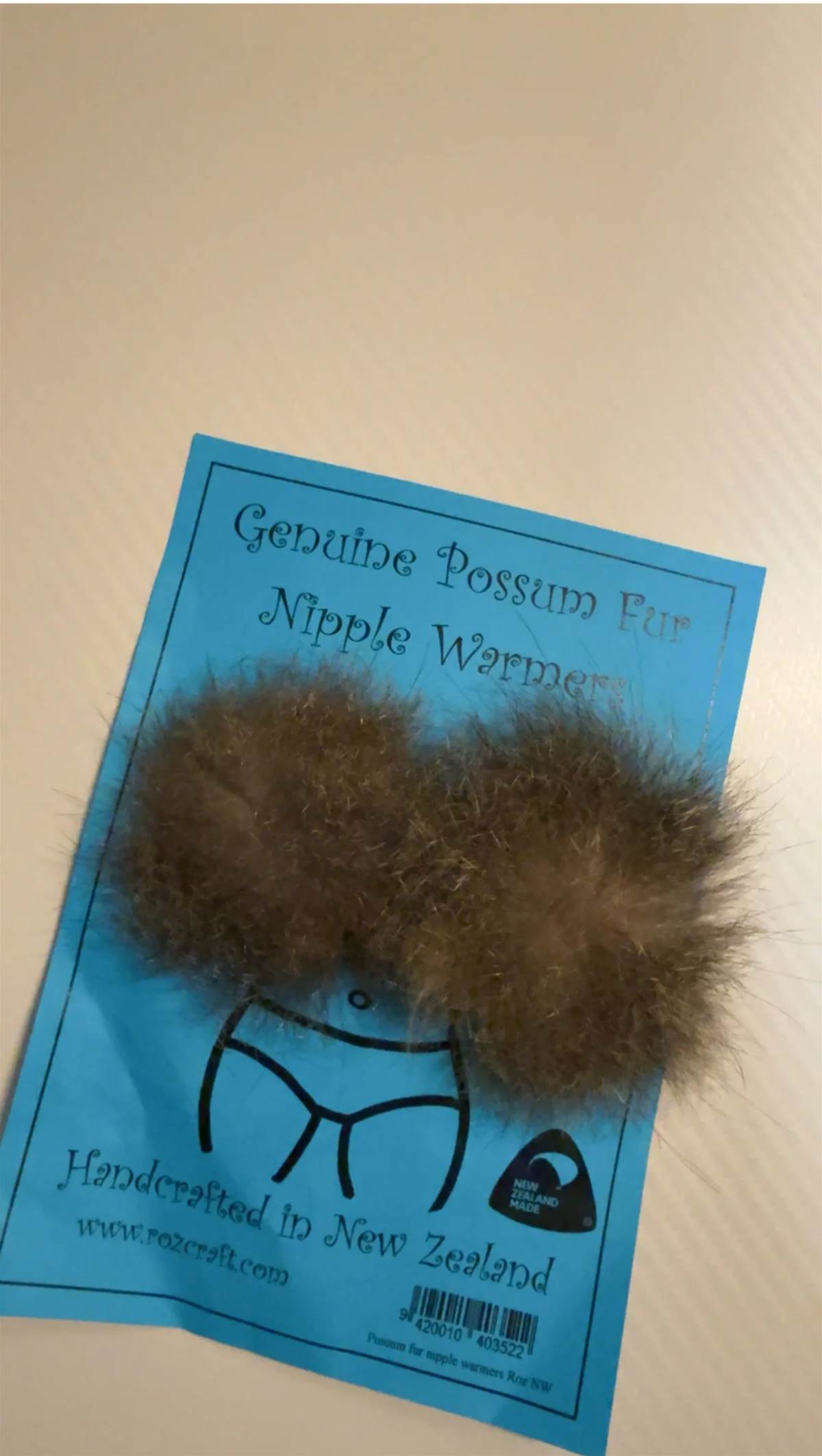 包裝卡紙上印著醒目標題「Genuine Possum Fur Nipple Warmers」,搭配簡筆畫人體圖示,底部註明「Handcrafted in New Zealand」。兩個柔軟的負鼠毛球靜置盒中,背面獨特的軟木塞設計更添神秘感。當事人坦言:「本來以為是化妝用的刷子,但看包裝圖案又不太像。」