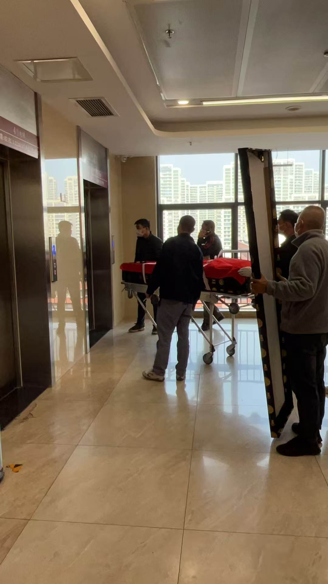醫院走廊的光線總是過于明亮,大理石地面反射著匆忙的鞋影。電梯門無聲滑開,幾名身著深色制服的工作人員推出一輛蓋著暗紅色絨布的四輪推車,絨佈下勾勒出長方形的輪廓。他們神色肅穆,動作沉穩,推著它向病房區深處走去,車輪碾過地面,發出輕微的、規律的聲響。