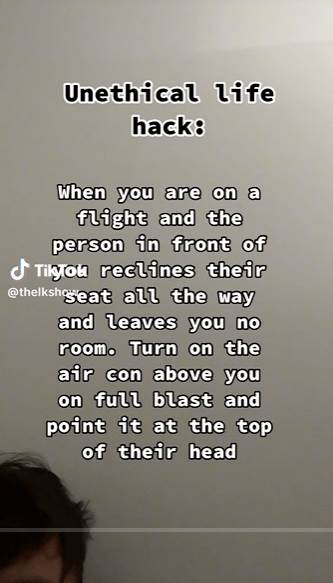 theLKshow寫道:「不道德的生活技巧:當你坐飛機時,你前面的人一直把座位向后傾斜,沒有給你留空間。你就將頭頂上的空調開到最大,對準他們的頭頂。」